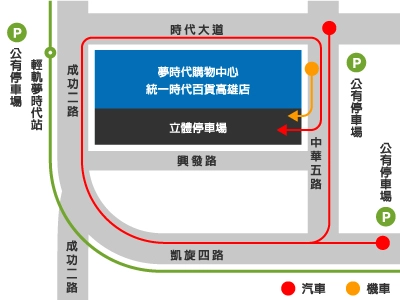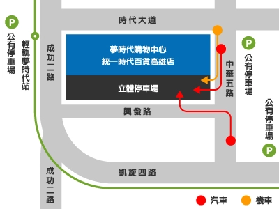 - 汽車:請沿凱旋路→成功路→時代大道→中華五路慢車道排隊入館