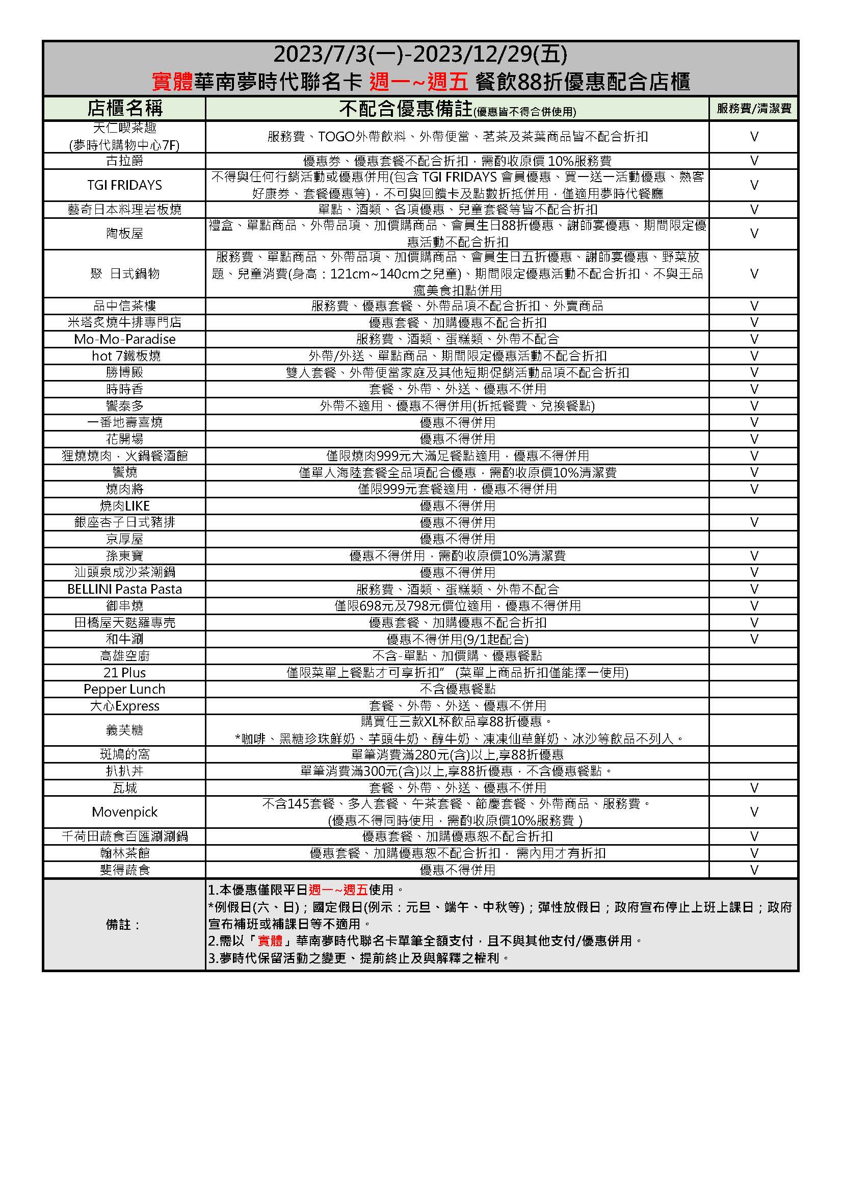 週一~週五於指定用餐店櫃,持「實體」華南夢時代聯名卡刷卡結帳金額享88折優惠。